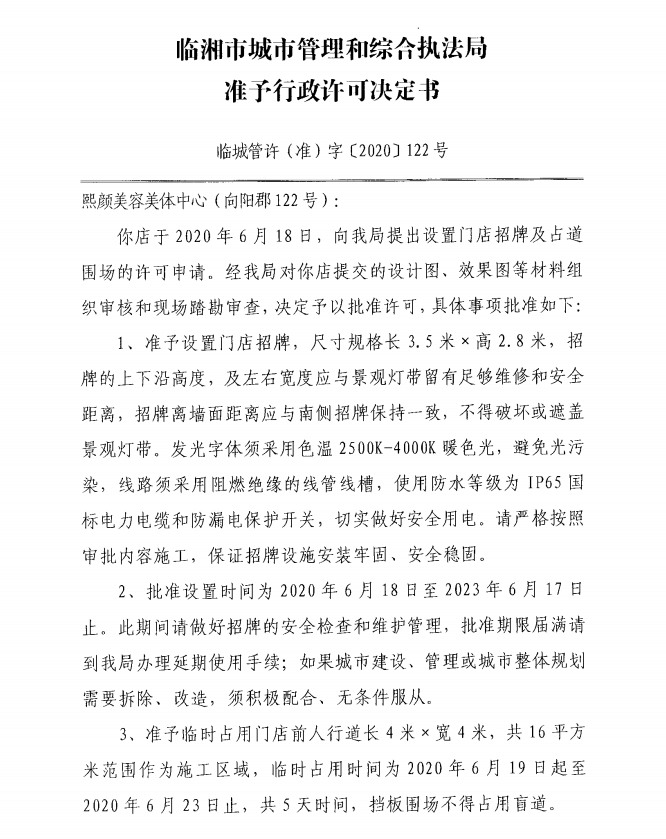 熙颜美容美体中心办理门店招牌设置、临时占用城市道路许可