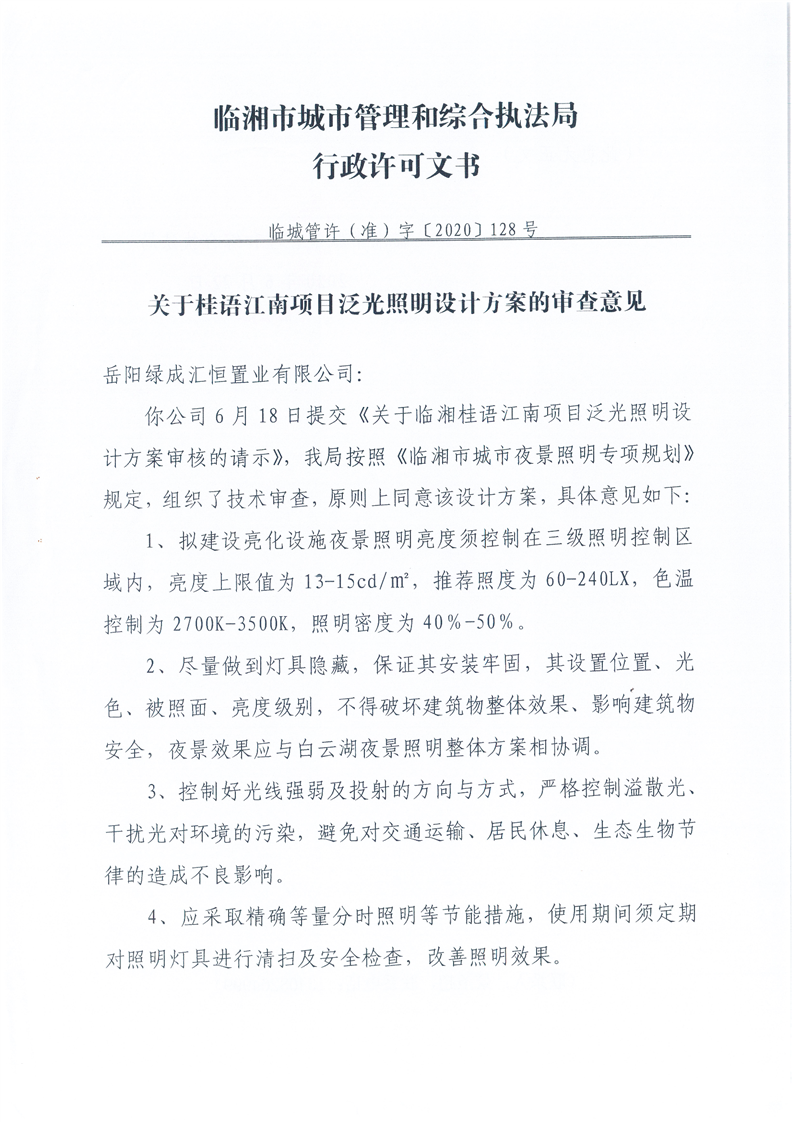岳阳绿成汇恒置业有限公司办理桂语江南项目泛光照明设计方案的审查意见
