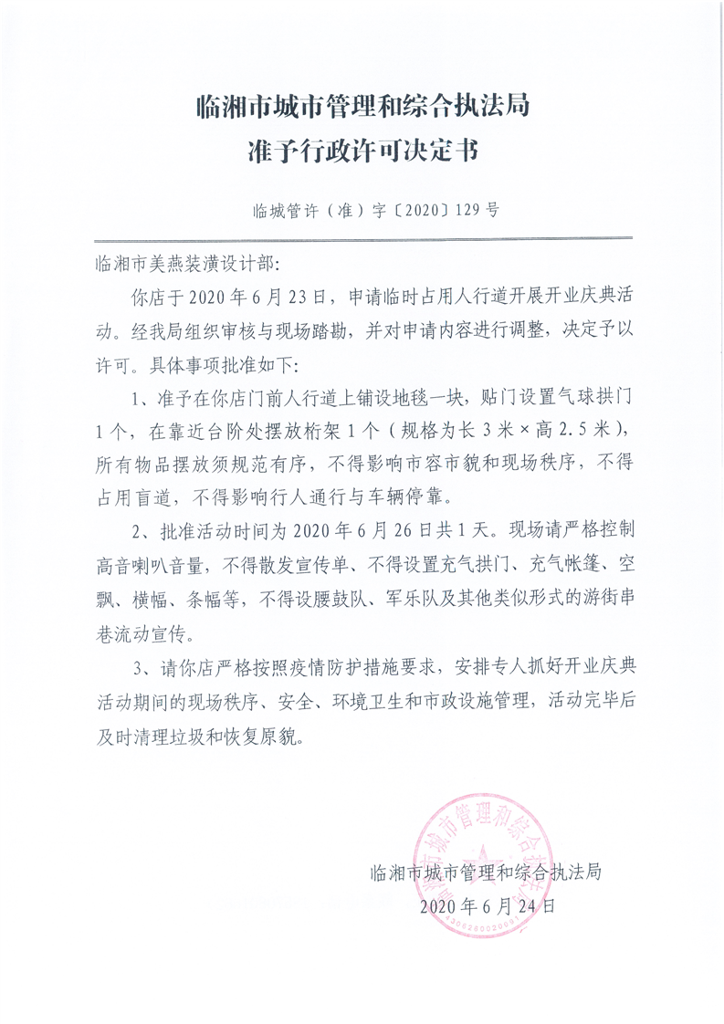 临湘市美燕装潢设计部办理临时占用街道两侧和公共场地许可