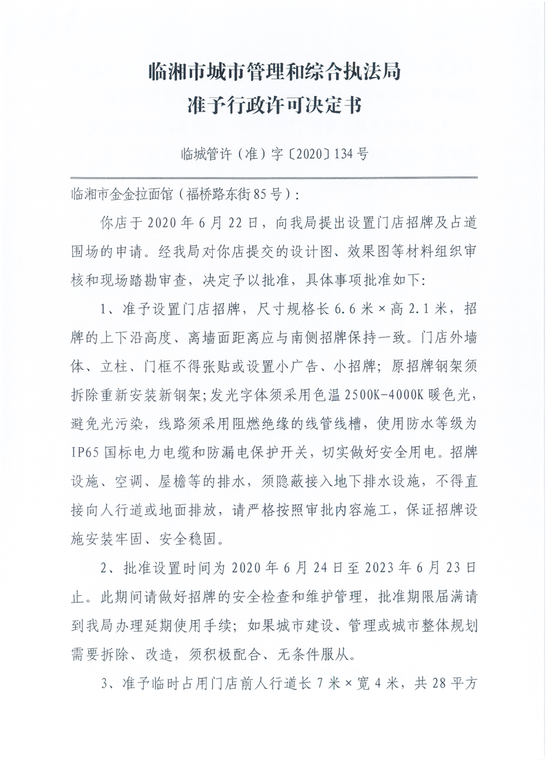 临湘市金金拉面馆办理门店招牌设置、临时占用城市道路许可