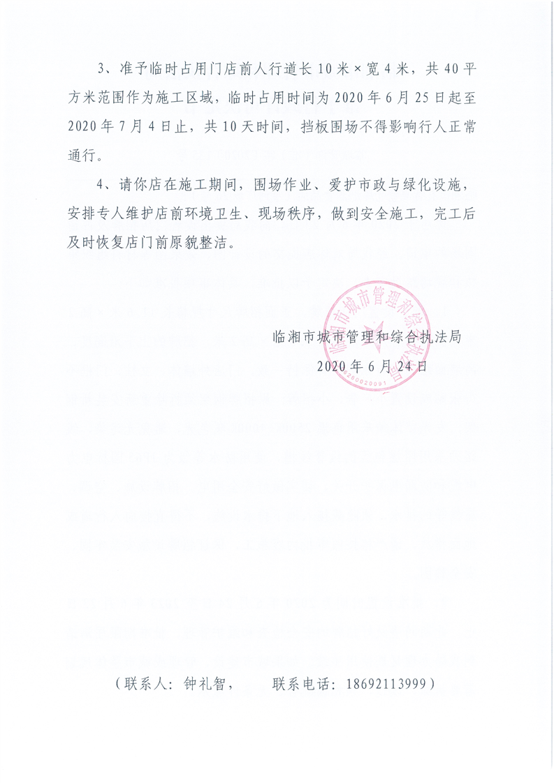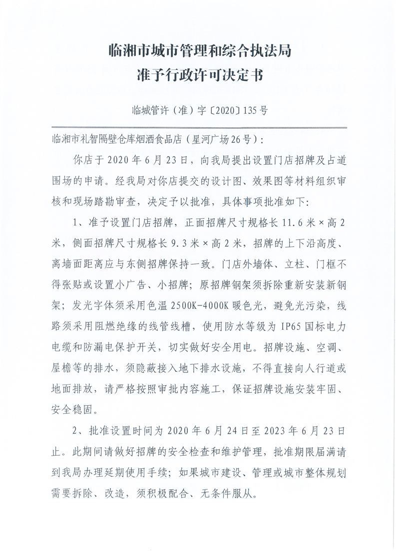 临湘市礼智隔壁仓库烟酒食品店办理门店招牌设置、临时占用城市道路许可