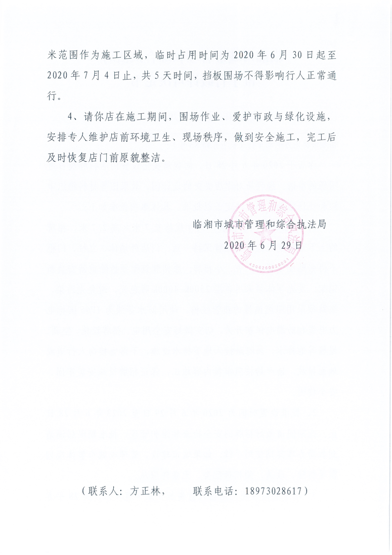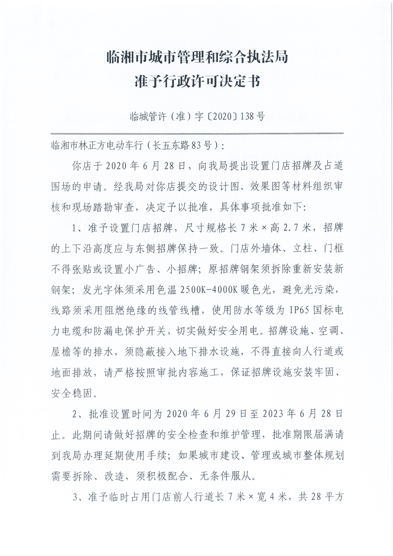 临湘市林正方电动车行办理门店招牌设置、临时占用城市道路许可