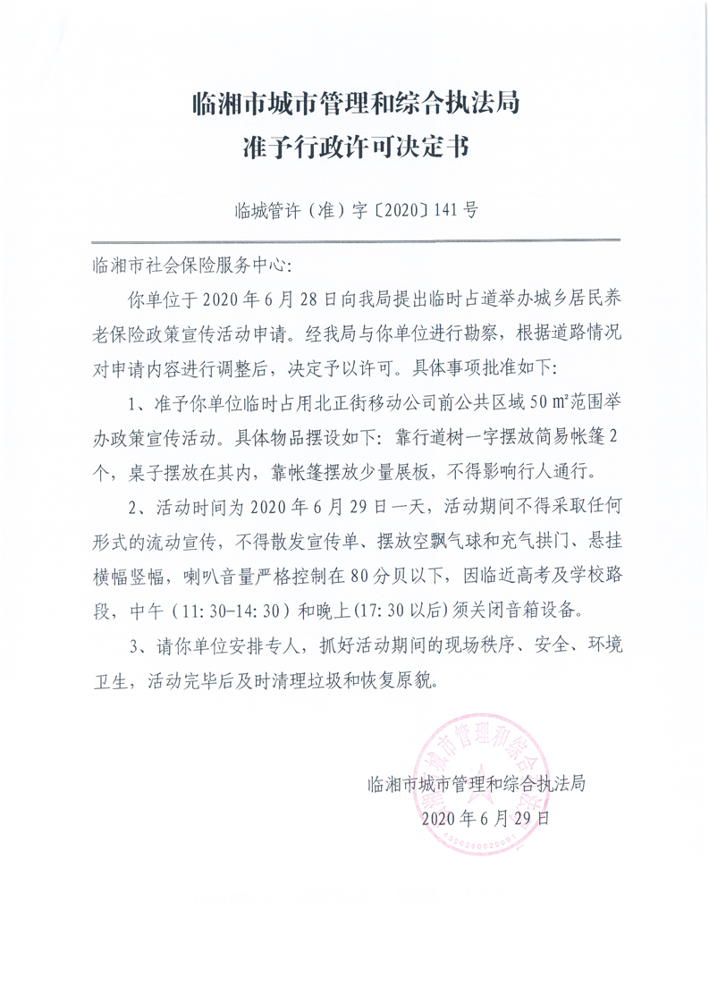临湘市社会保险服务中心办理临时占用街道两侧和公共场地许可