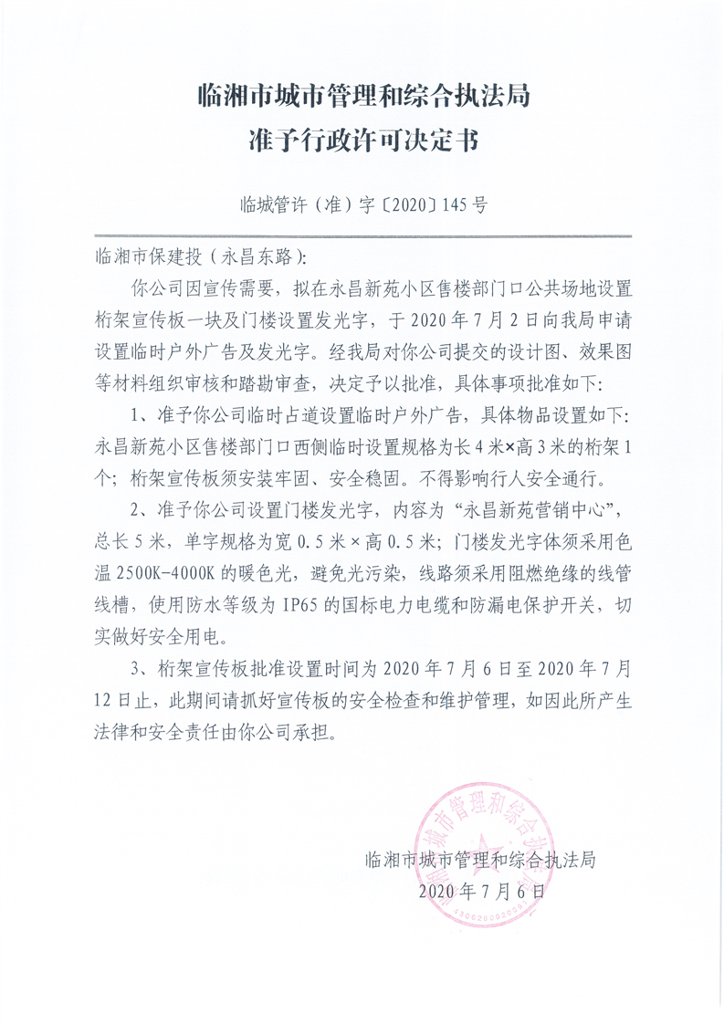 临湘市保建投办理桁架宣传板设置、楼顶发光字设置许可