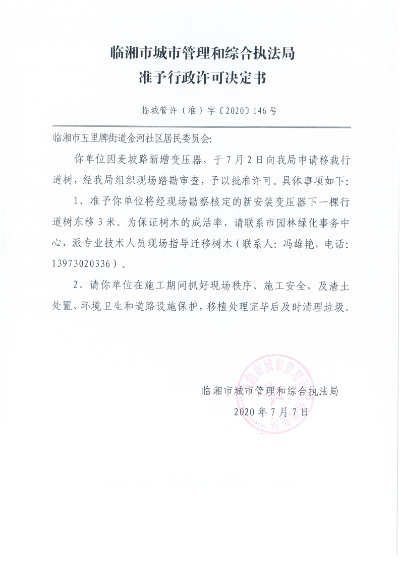 临湘市五里牌街道金河社区居民委员会办理迁移城市树木许可