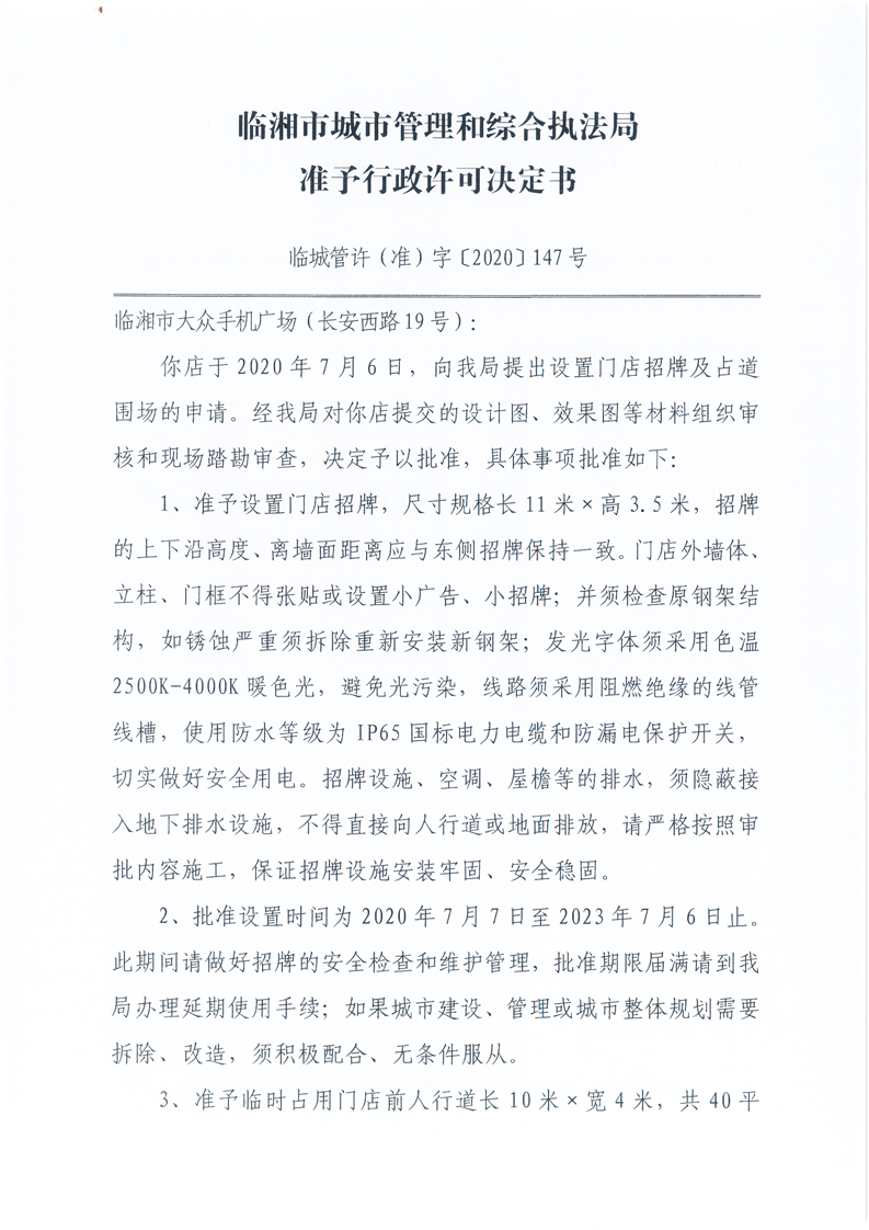 临湘市大众手机广场办理门店招牌设置、临时占用城市道路许可