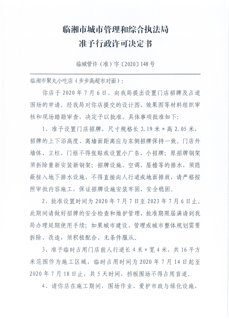 临湘市聚丸小吃店办理门店招牌设置、临时占用城市道路许可
