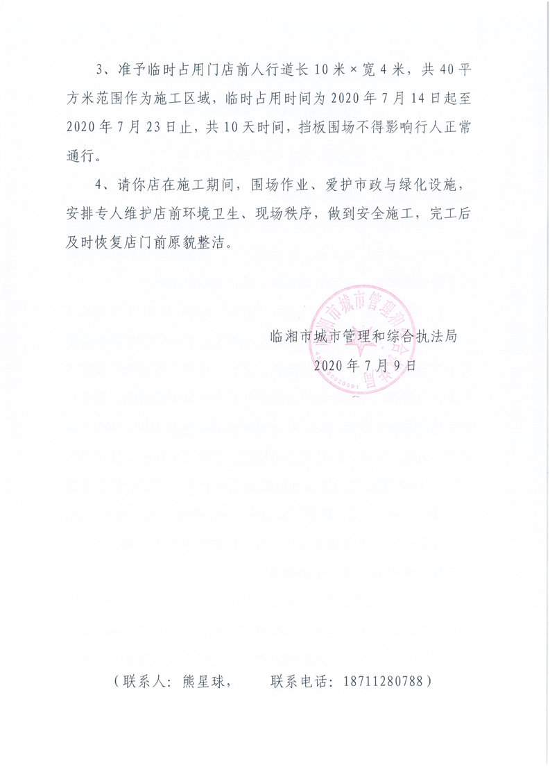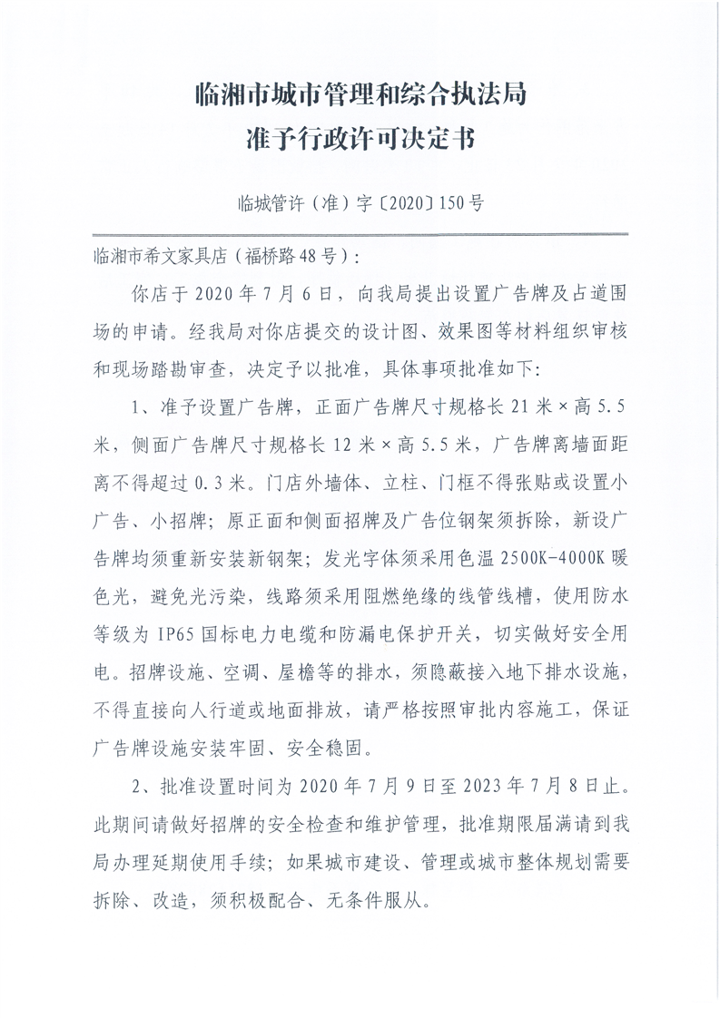临湘市希文家具店办理门店招牌设置、临时占用城市道路许可