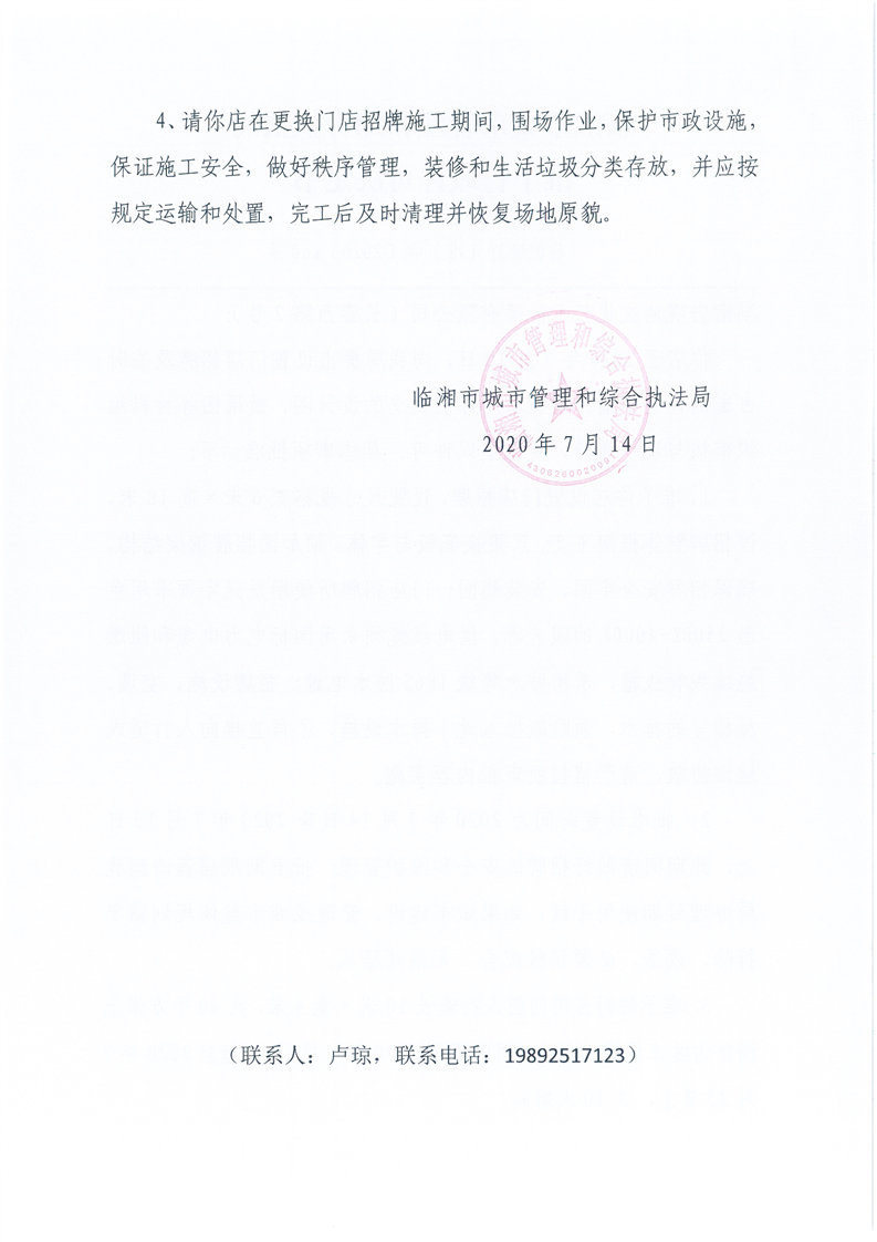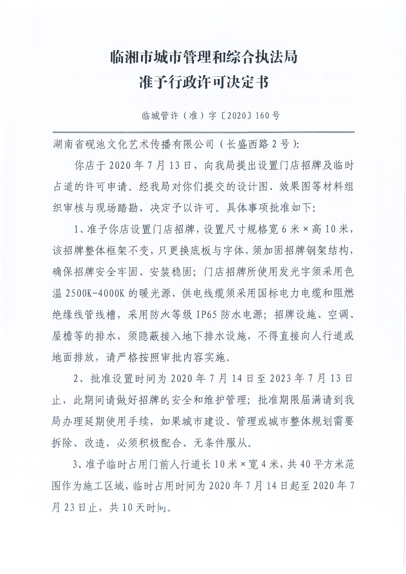 湖南省砚池文化艺术传播有限公司办理门店招牌设置、临时占用城市道路许可