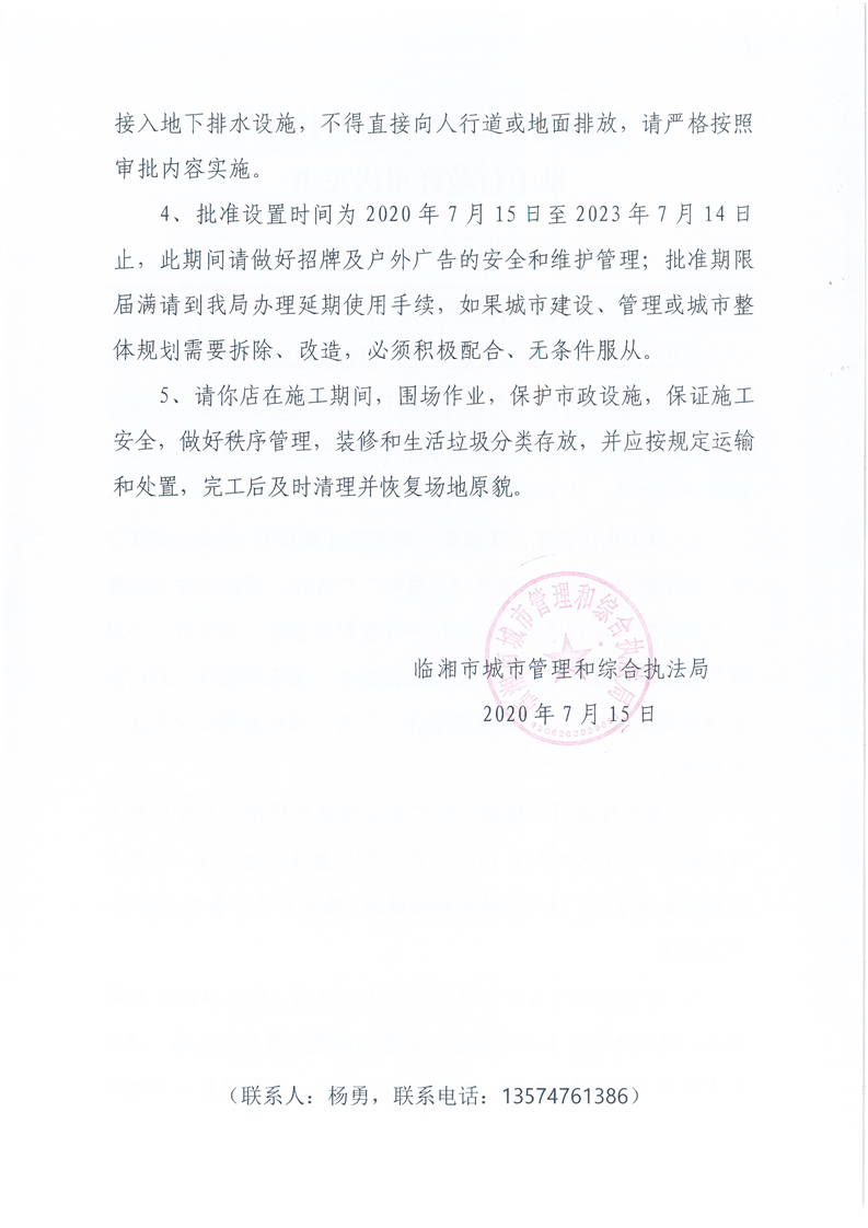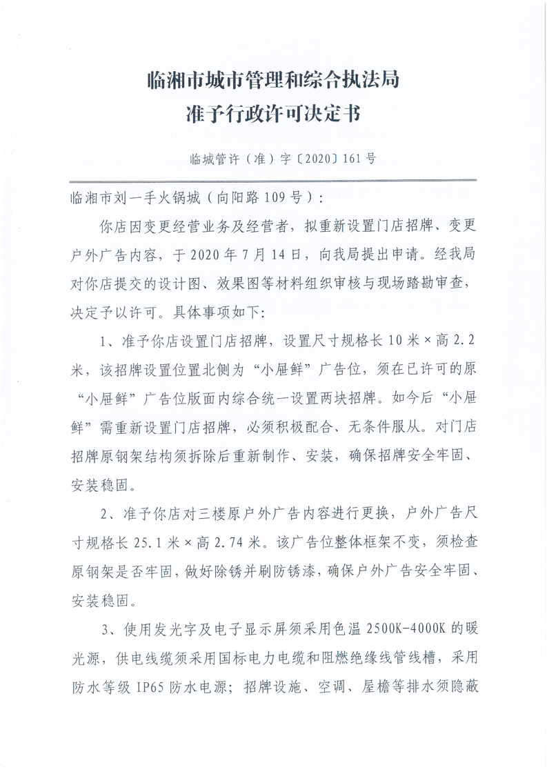 临湘市刘一手火锅城办理门店招牌、广告位设置许可