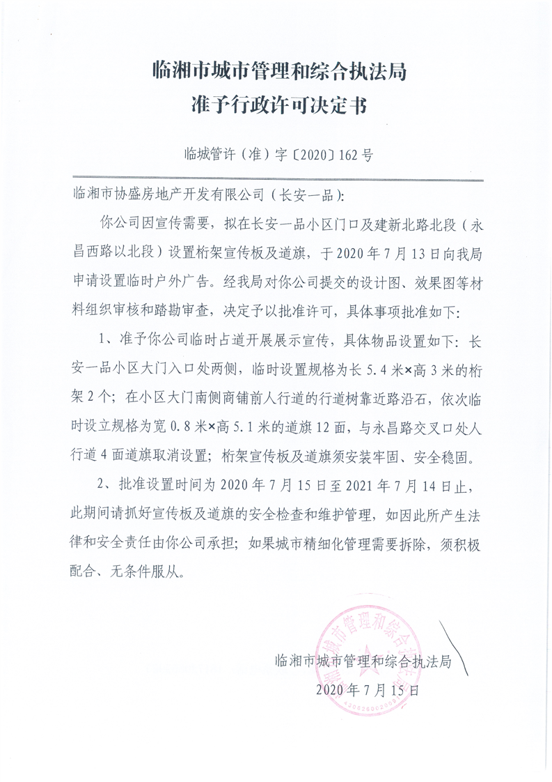 临湘市协盛房地产开发有限公司(长安一品)办理临时占用街道两侧和公共场地许可