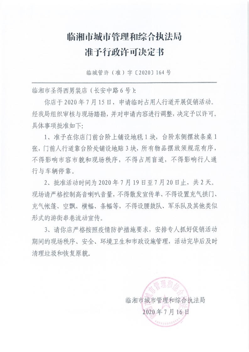 临湘市圣得西男装店办理临时占用街道两侧和公共场地许可