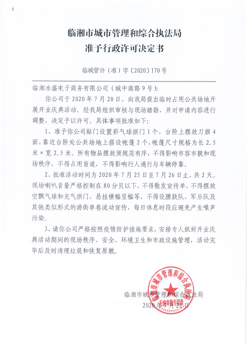 临湘永盛电子商务有限公司办理临时占用街道两侧和公共场地许可
