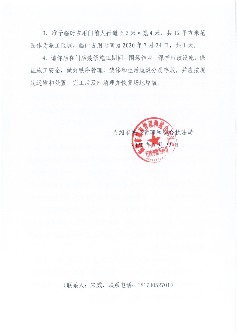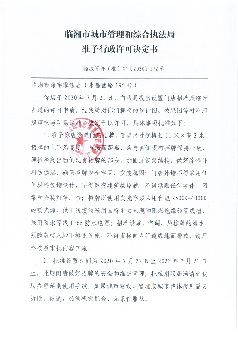 临湘市涤宇零售店办理门店招牌设置、临时占用城市道路许可