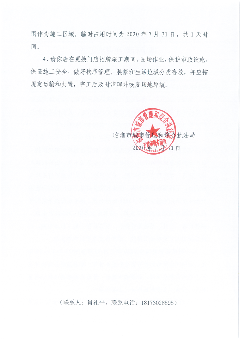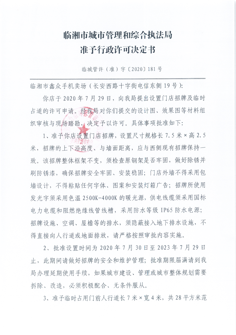 临湘市鑫众手机卖场办理门店招牌设置、临时占用城市道路许可