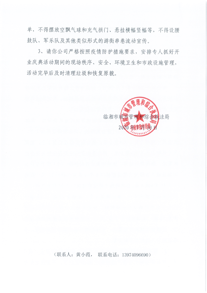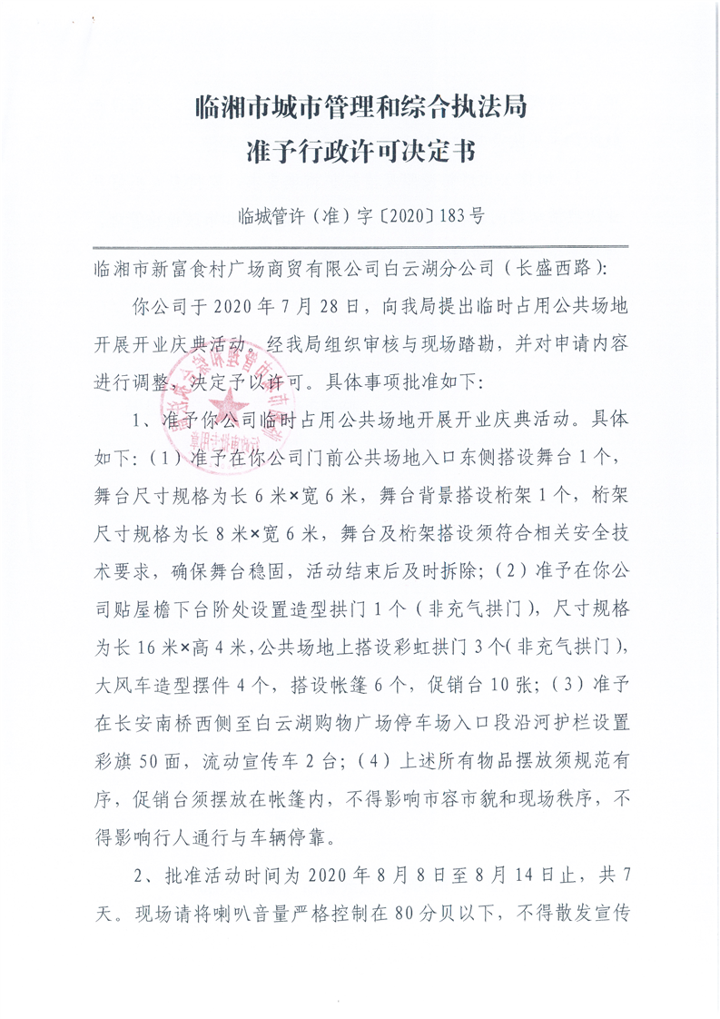 临湘市新富食村广场商贸有限公司白云湖分公司办理临时占用街道两侧和公共场地许可