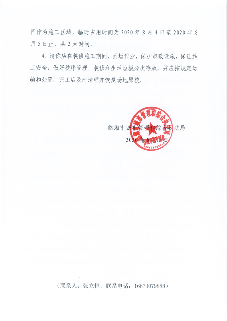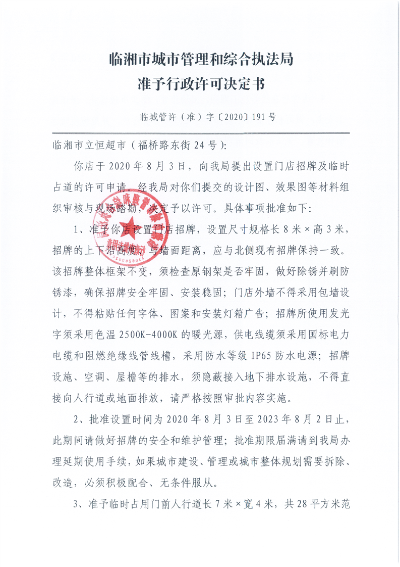 临湘市立恒超市办理门店招牌设置、临时占用城市道路许可