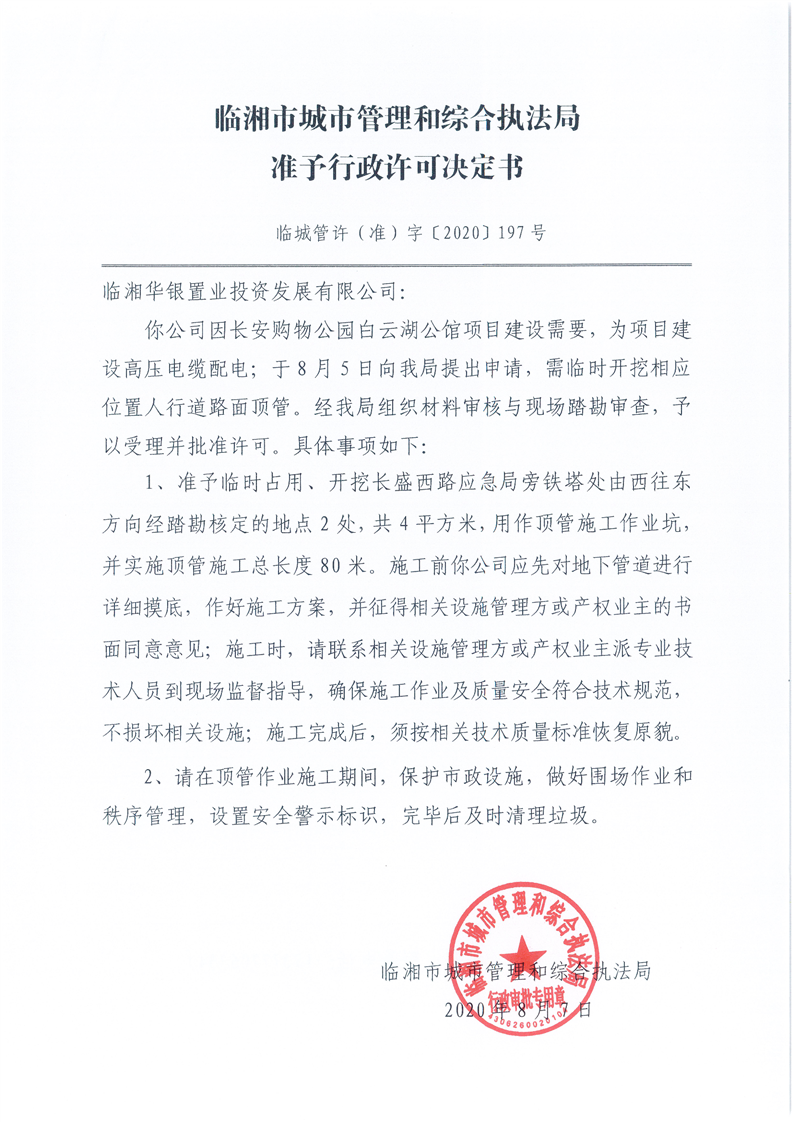 临湘华银置业投资发展有限公司办理临时挖掘城市道路许可