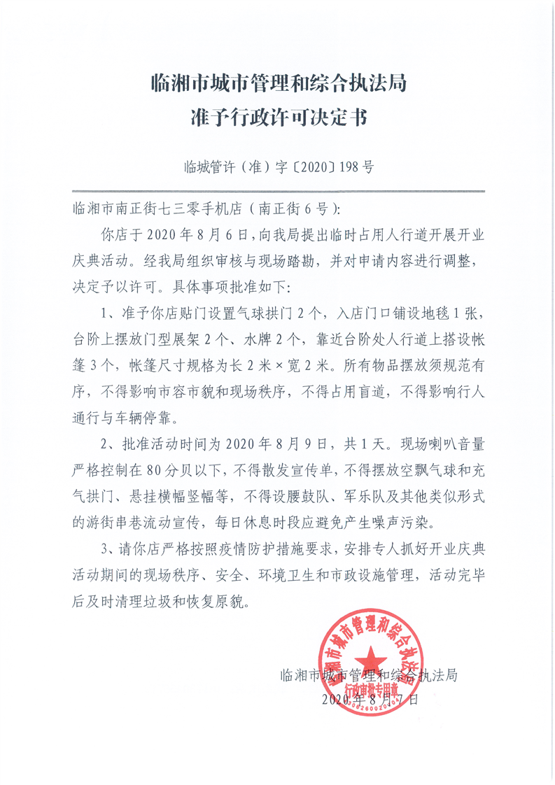 临湘市南正街七三零手机店办理临时占用街道两侧和公共场地许可