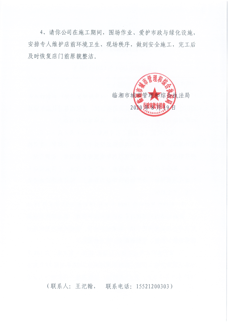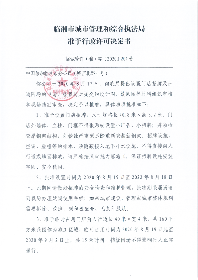 中国移动临湘市分公司办理门店招牌设置、临时占用城市道路许可