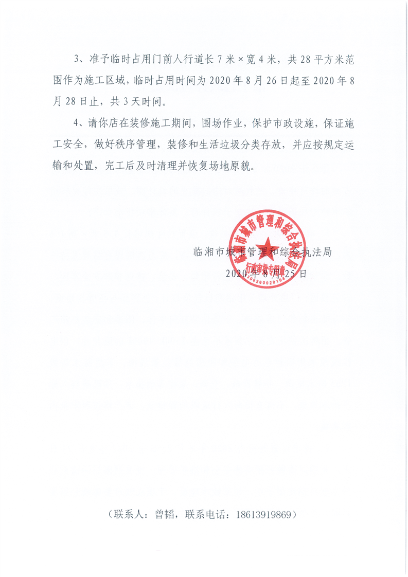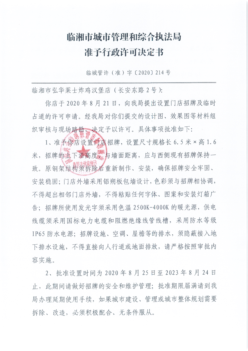 临湘市弘华莱士炸鸡汉堡店办理门店招牌设置、临时占用城市道路许可