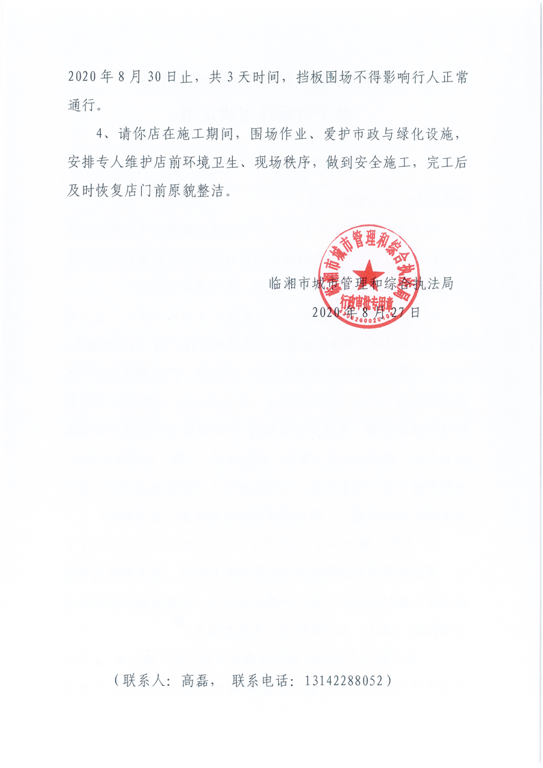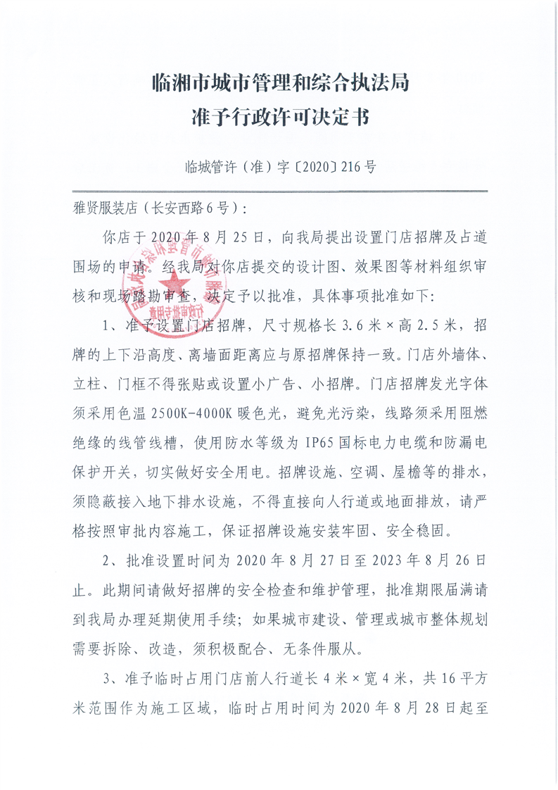 雅贤服装店办理门店招牌设置、临时占用城市道路许可