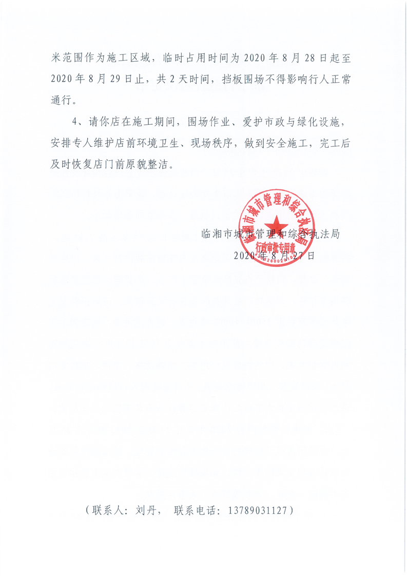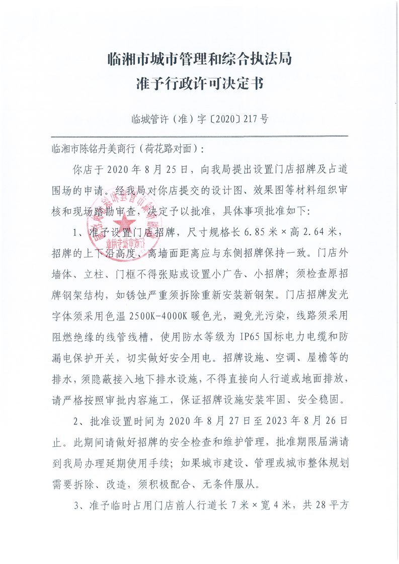 临湘市陈铭丹美商行办理门店招牌设置、临时占用城市道路许可
