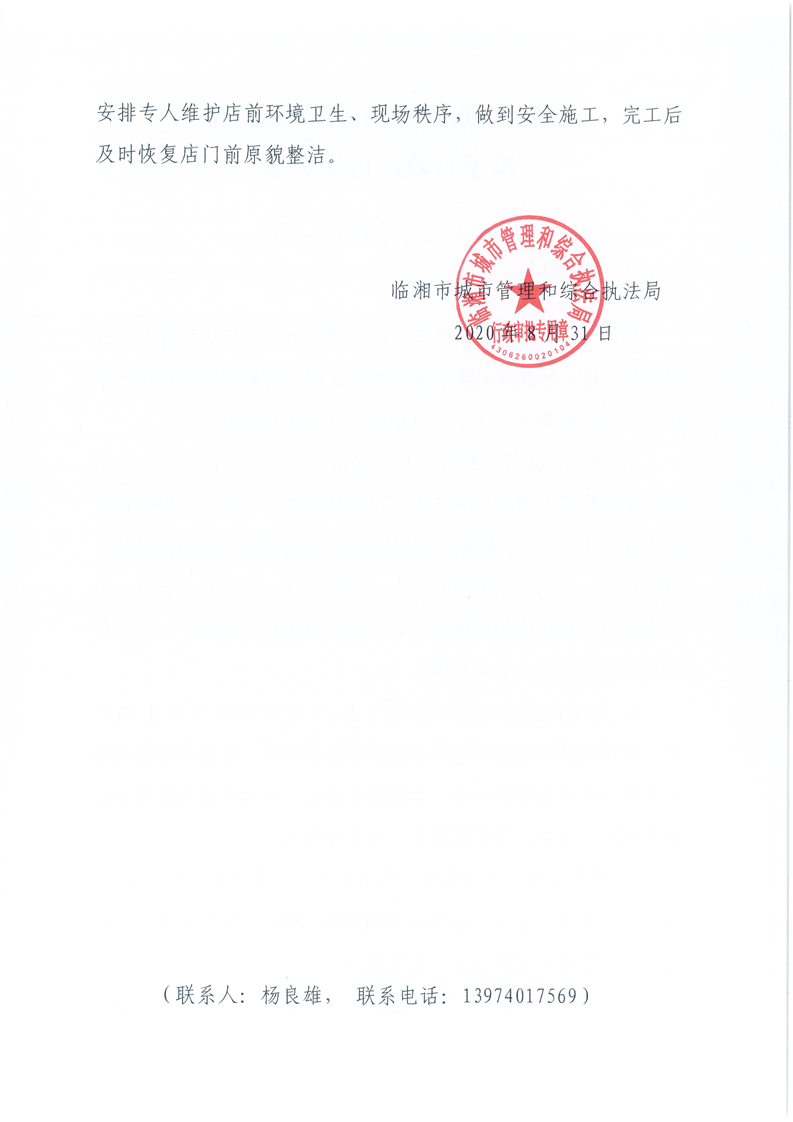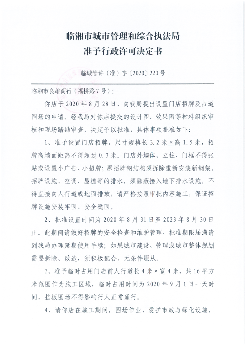 临湘市良雄商行办理门店招牌设置、临时占用城市道路许可