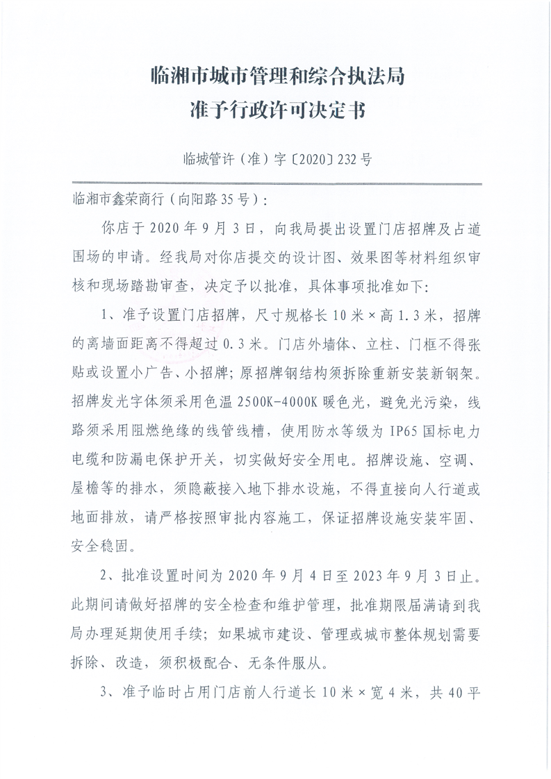 临湘市鑫荣商行办理门店招牌设置、临时占用城市道路许可