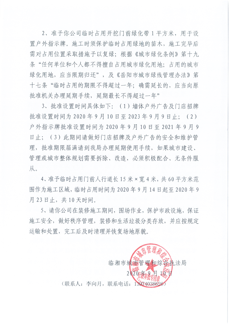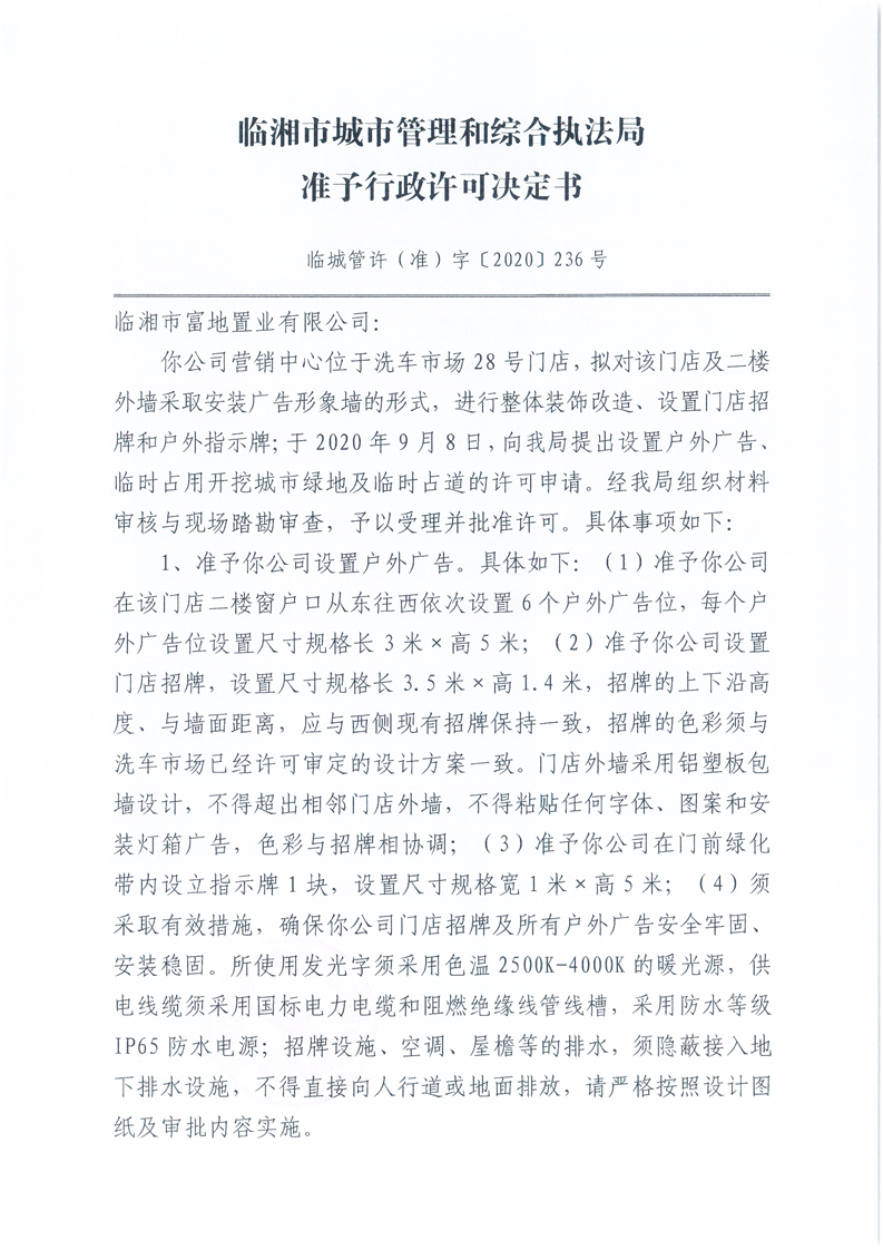 临湘市富地置业有限公司办理广告位设置、临时占用城市道路许可