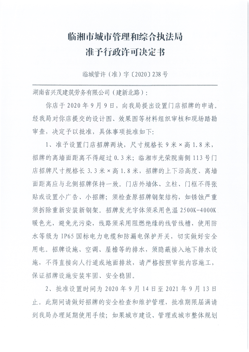 湖南省兴茂建筑劳务有限公司办理门店招牌设置许可
