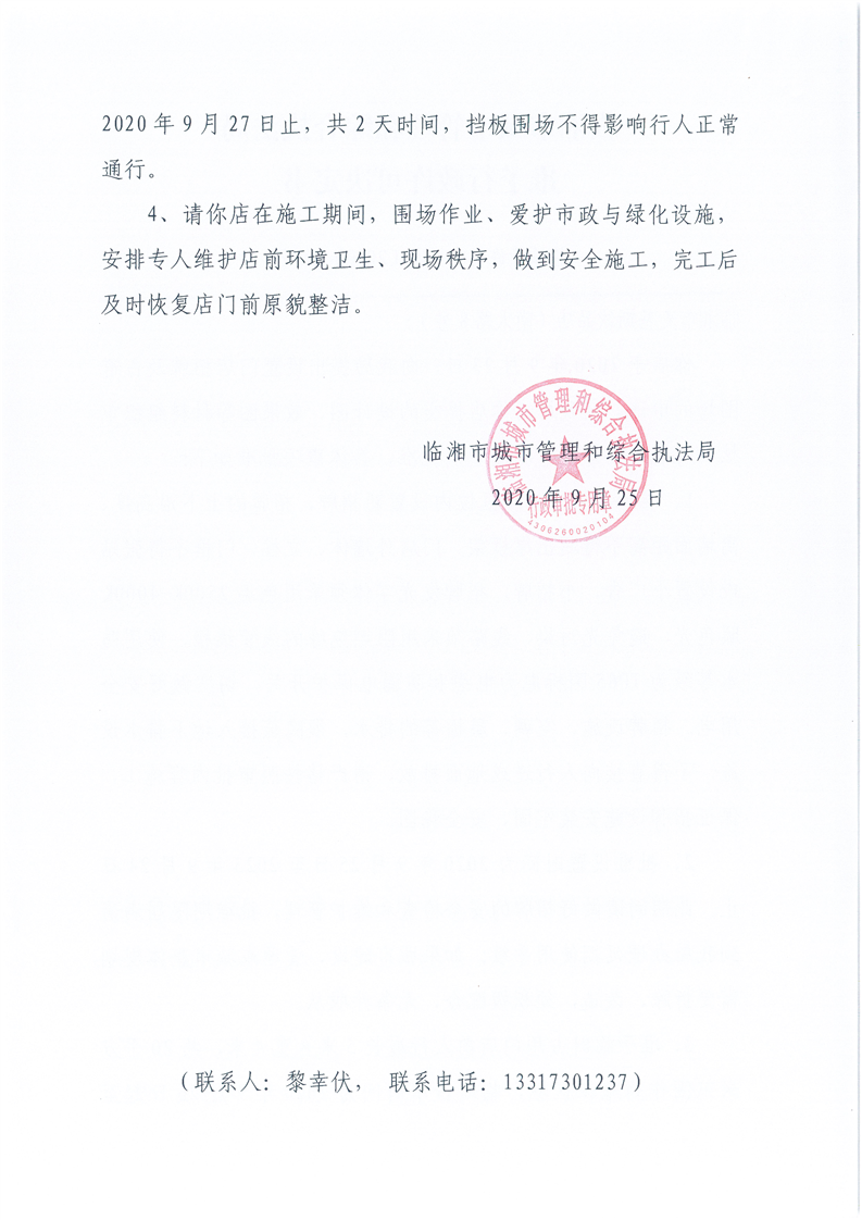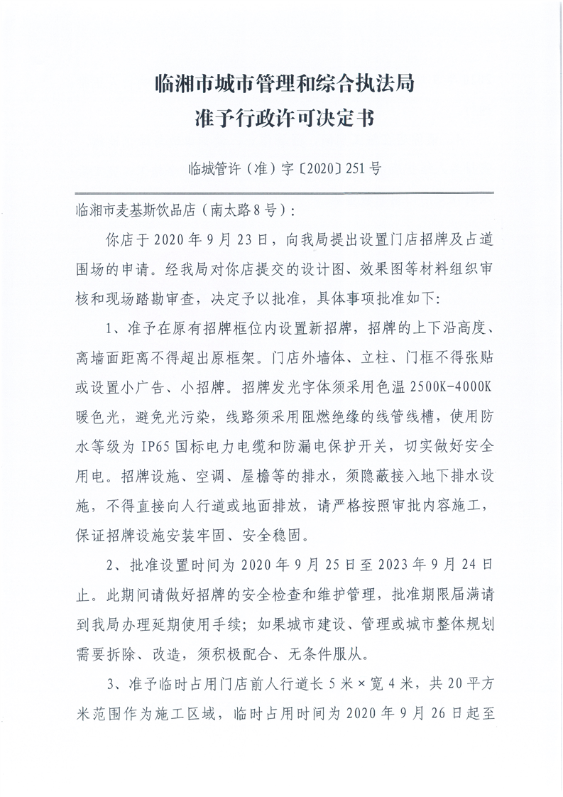 临湘市麦基斯饮品店办理门店招牌设置、临时占用城市道路许可