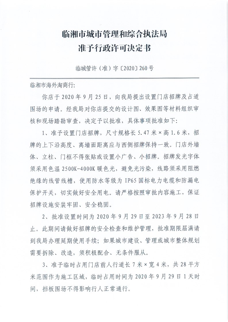 临湘市海外淘商行办理门店招牌设置、临时占用城市道路许可