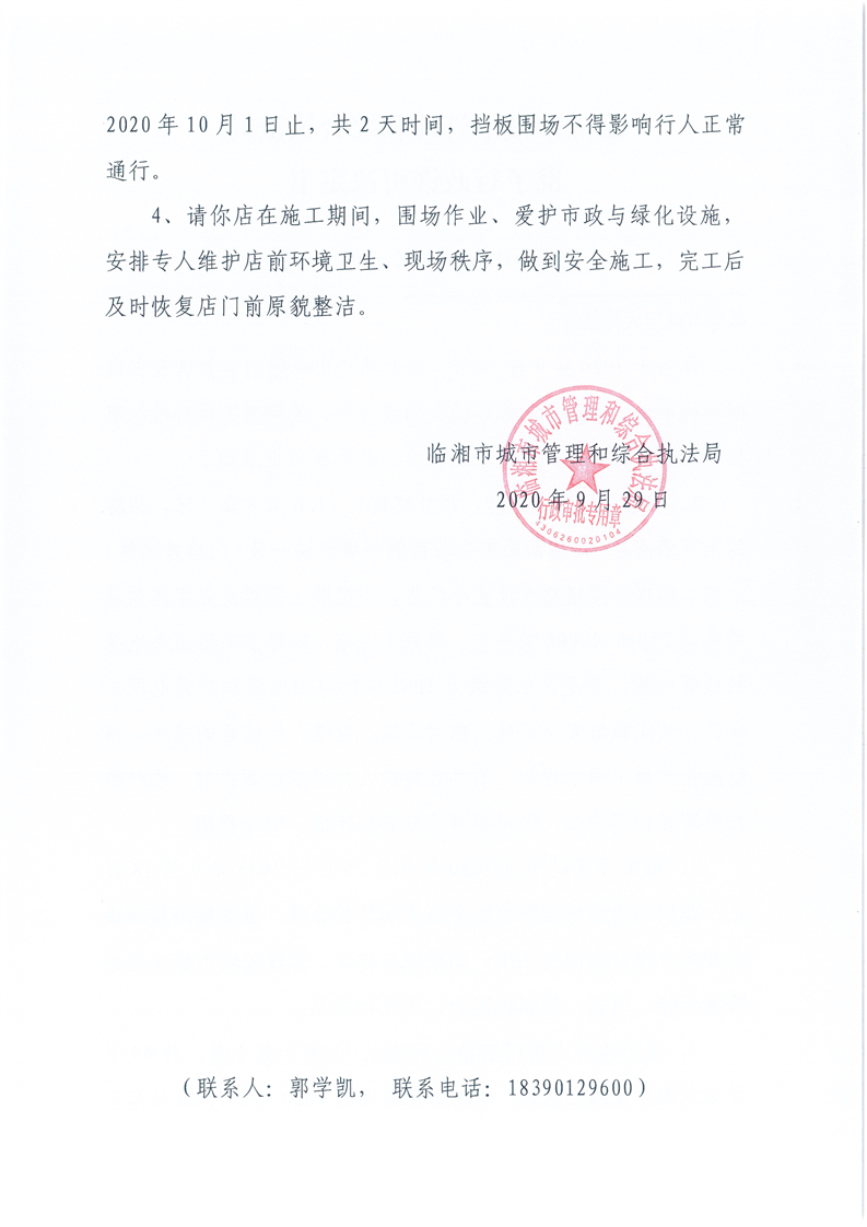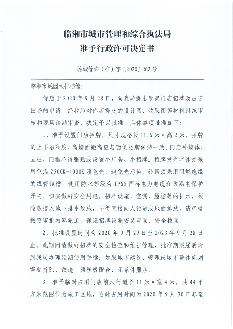 临湘市蚝园大排档馆办理门店招牌设置、临时占用城市道路许可