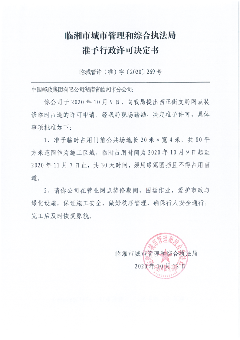 中国邮政集团有限公司湖南省临湘市分公司办理临时占用城市道路许可
