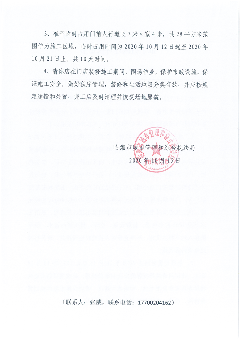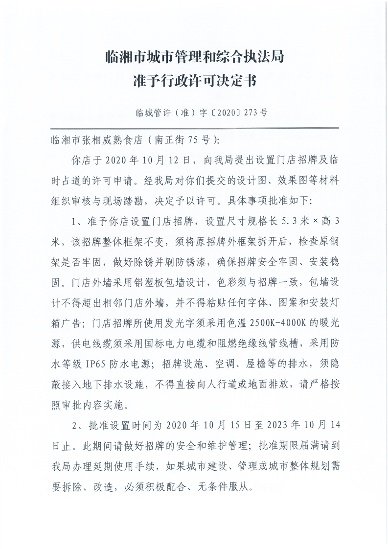 临湘市张相威熟食店办理门店招牌设置、临时占用城市道路许可