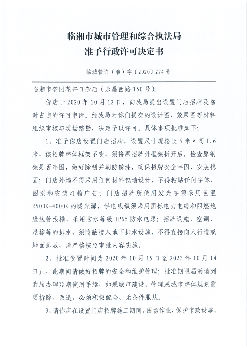 临湘市梦园花卉日杂店办理门店招牌设置许可