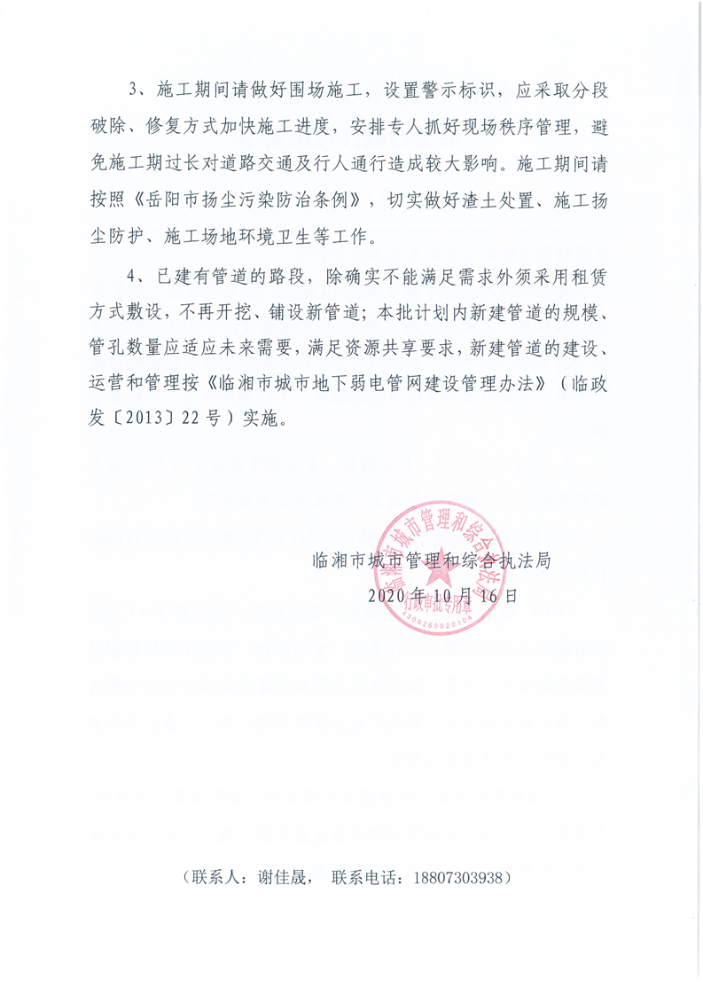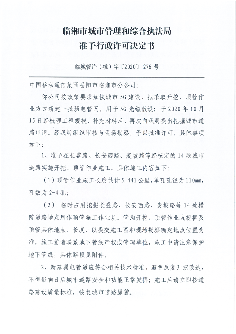 中国移动通信集团岳阳市临湘市分公司办理临时占用、挖掘城市道路许可