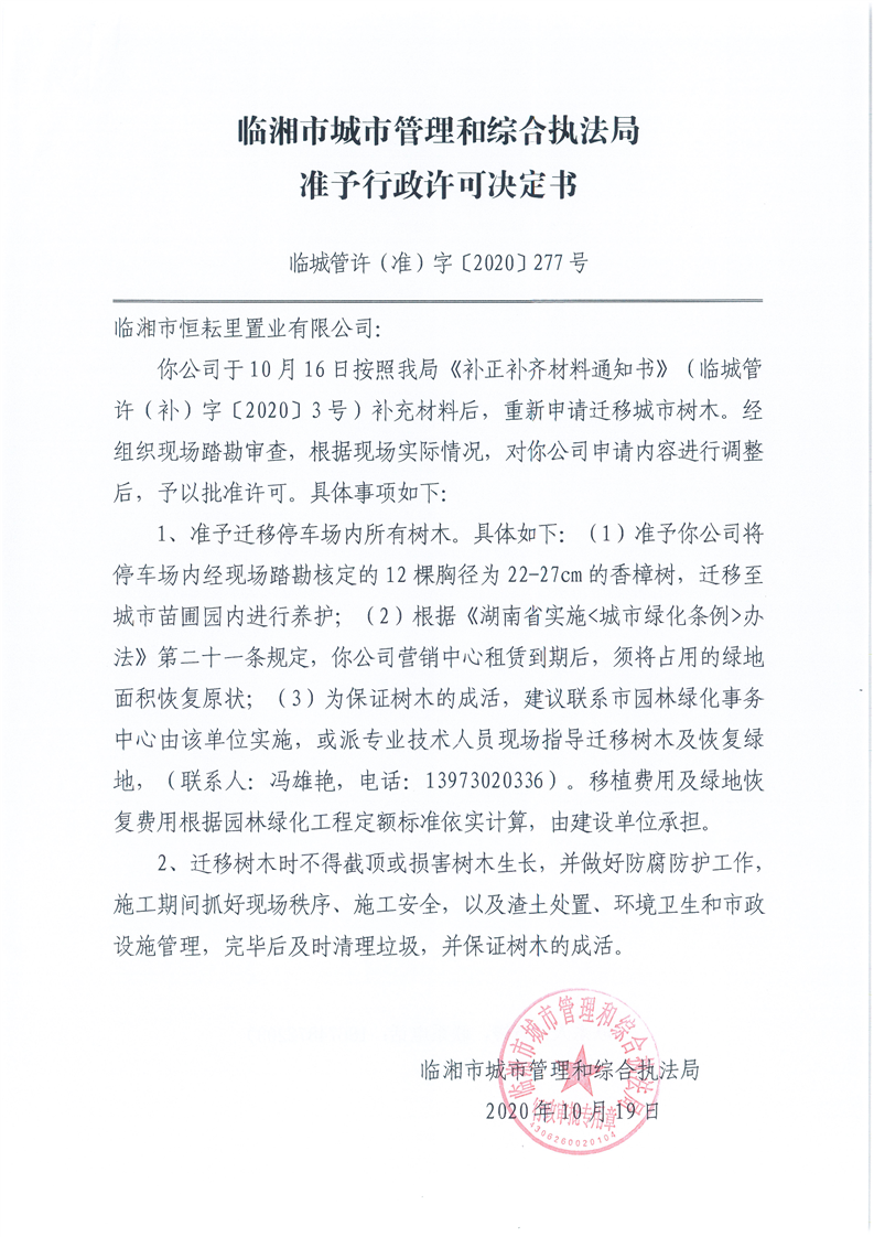 临湘市恒耘李置业有限公司办理迁移城市树木许可