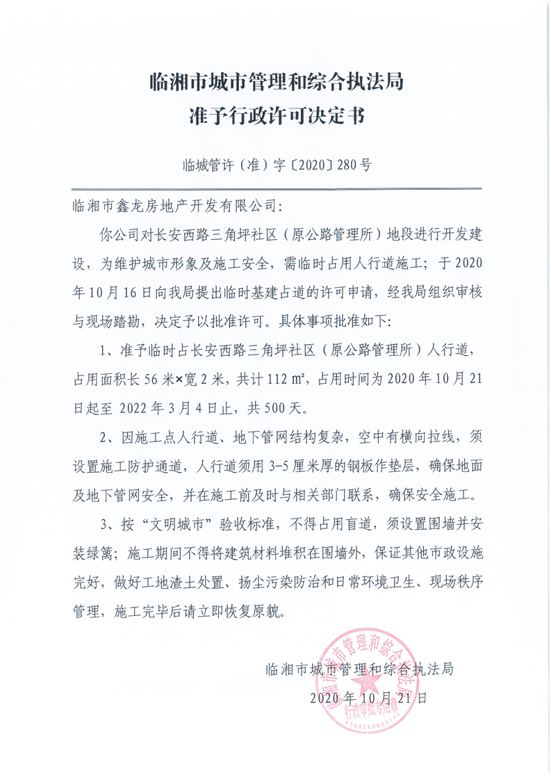 临湘市鑫龙房地产开发有限公司办理临时占用城市道路许可