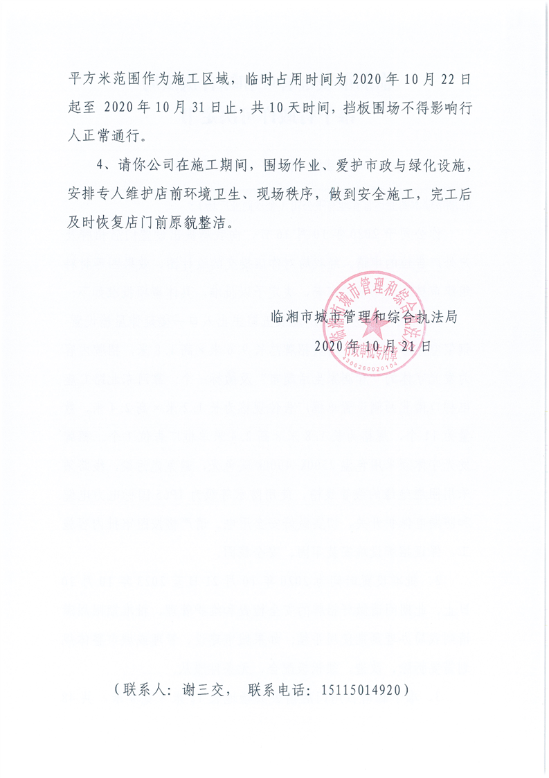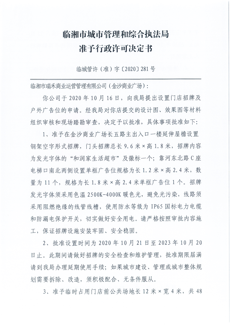 临湘市瑞禾商业运营管理有限公司办理门店招牌设置、临时占用城市道路许可