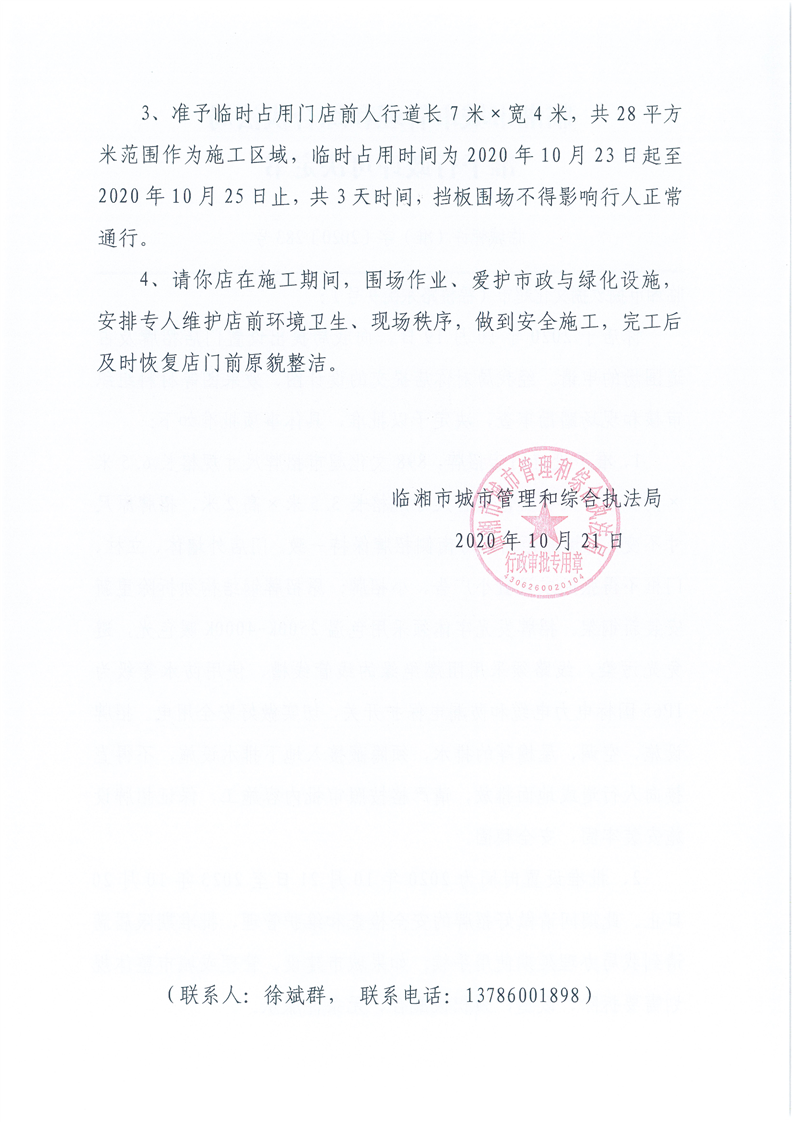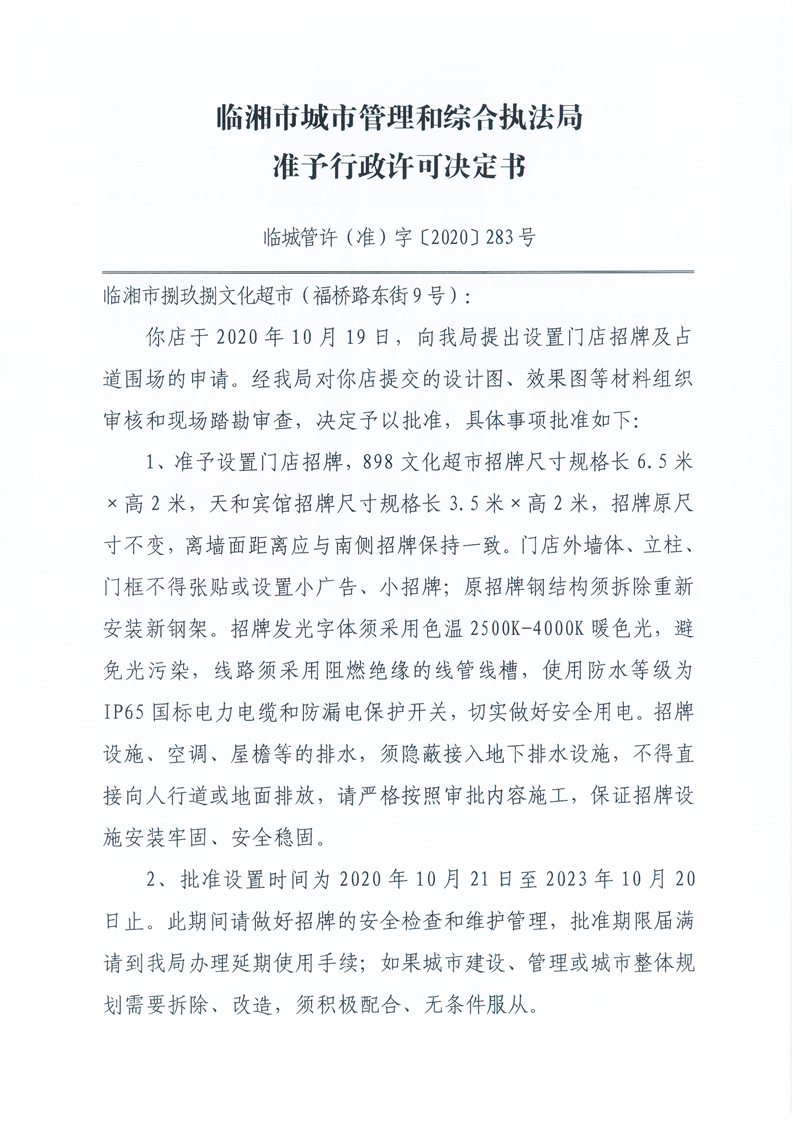 临湘市捌玖捌文化超市办理门店招牌设置、临时占用城市道路许可