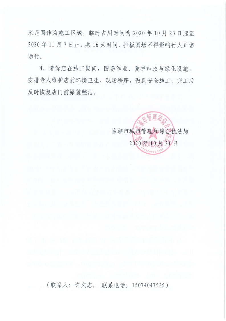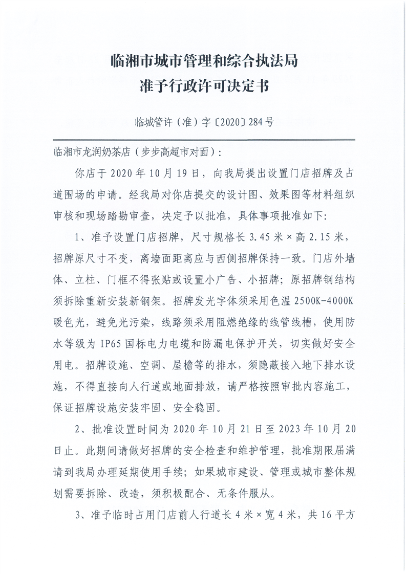 临湘市龙润奶茶店办理门店招牌设置、临时占用城市道路许可
