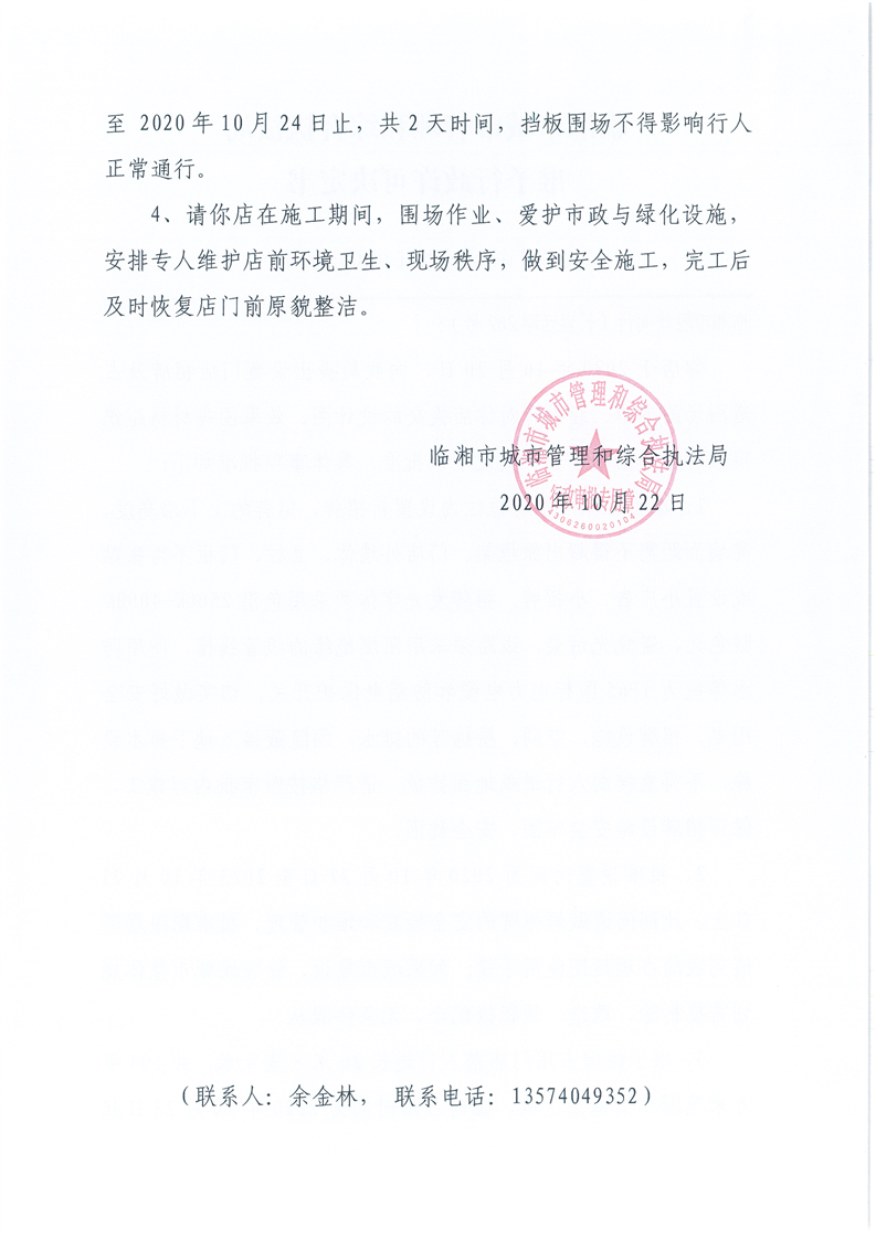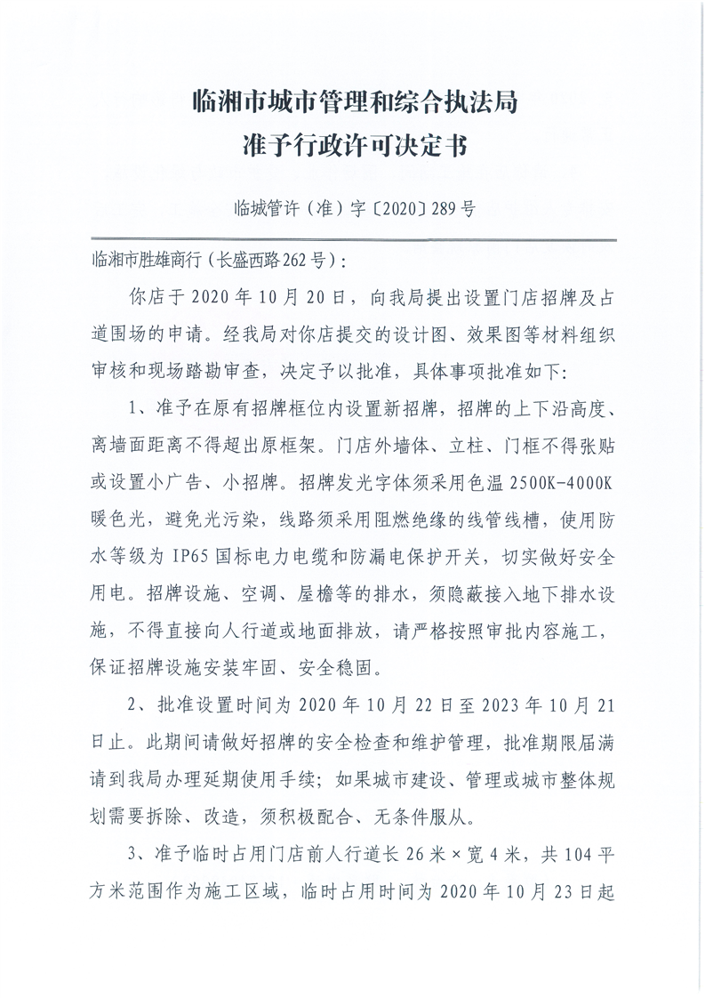 临湘市胜雄商行办理门店招牌设置、临时占用城市道路许可