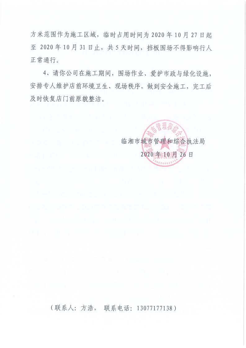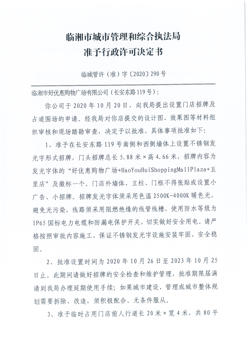 临湘市好优惠购物广场有限公司办理门店招牌设置、临时占用城市道路许可