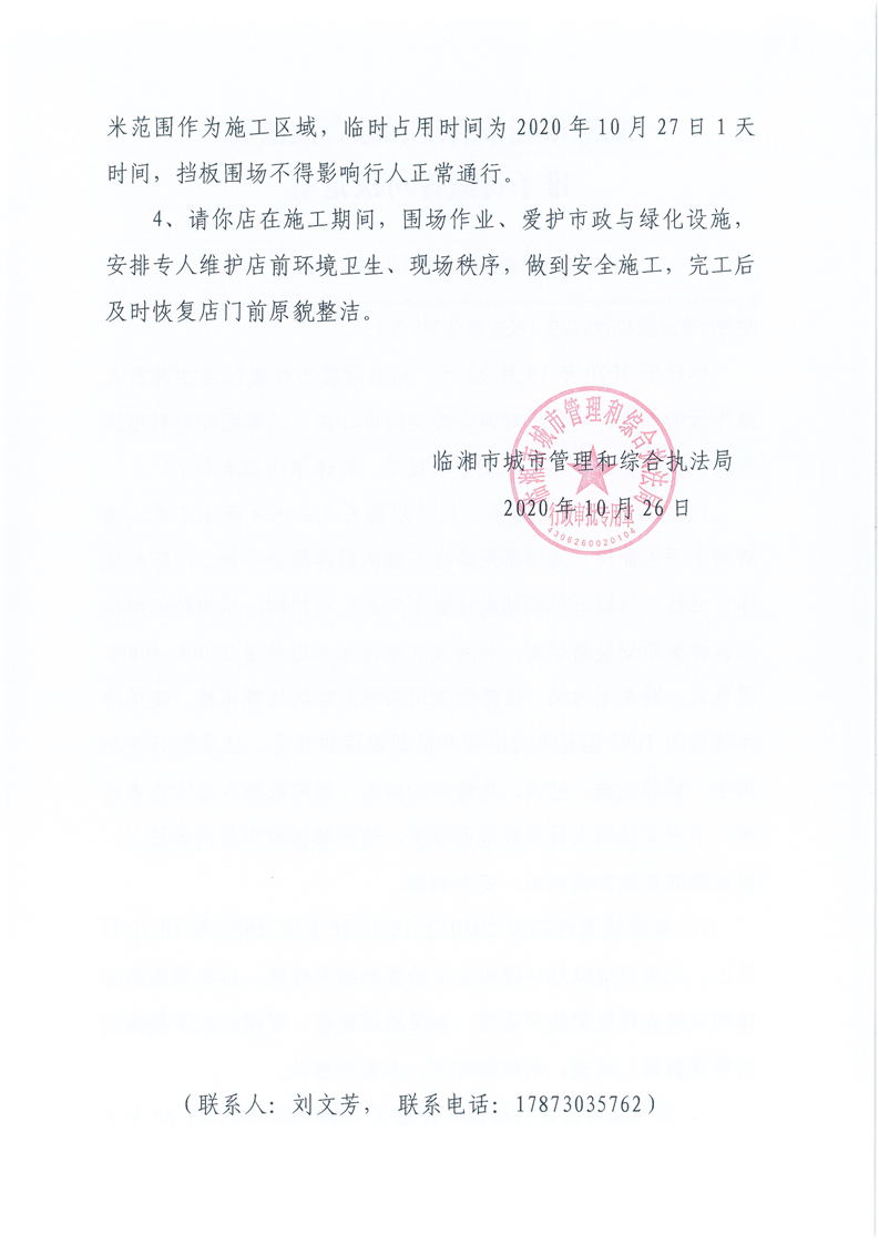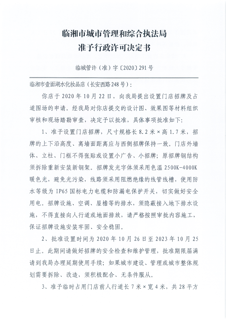 临湘市壹面湖水化妆品店办理门店招牌设置、临时占用城市道路许可