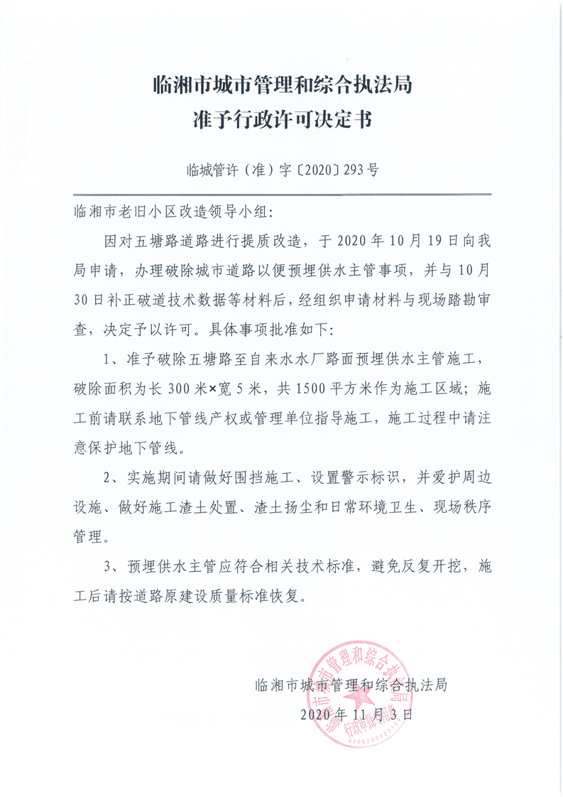 临湘市老旧小区(五塘路)改造领导小组办理临时挖掘城市道路许可