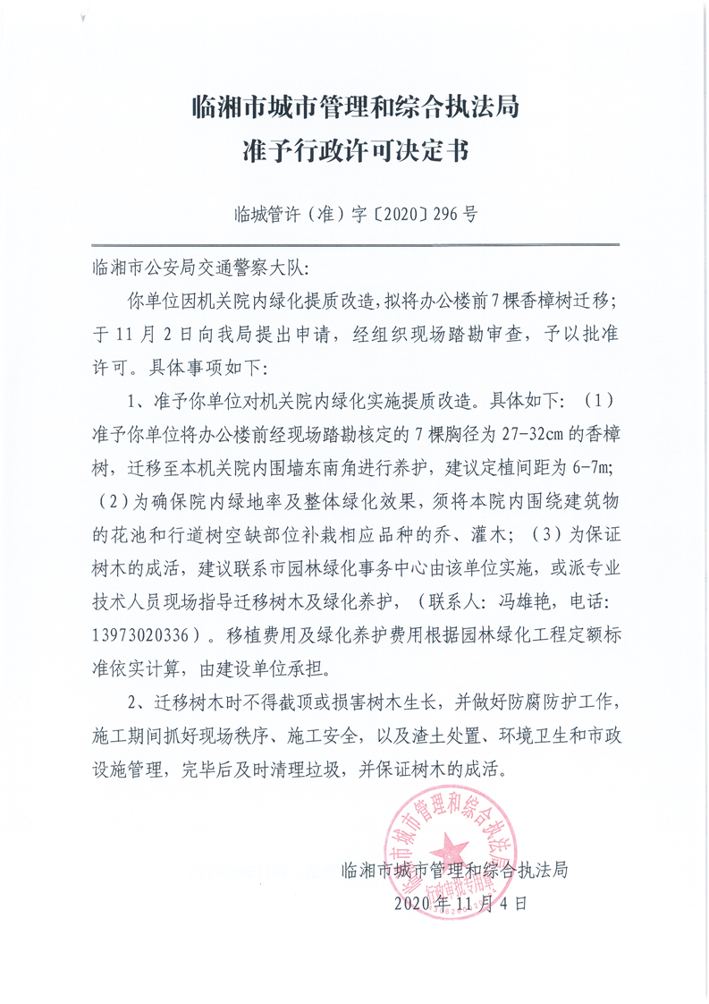 临湘市公安局交通警察大队办理移栽城市树木许可