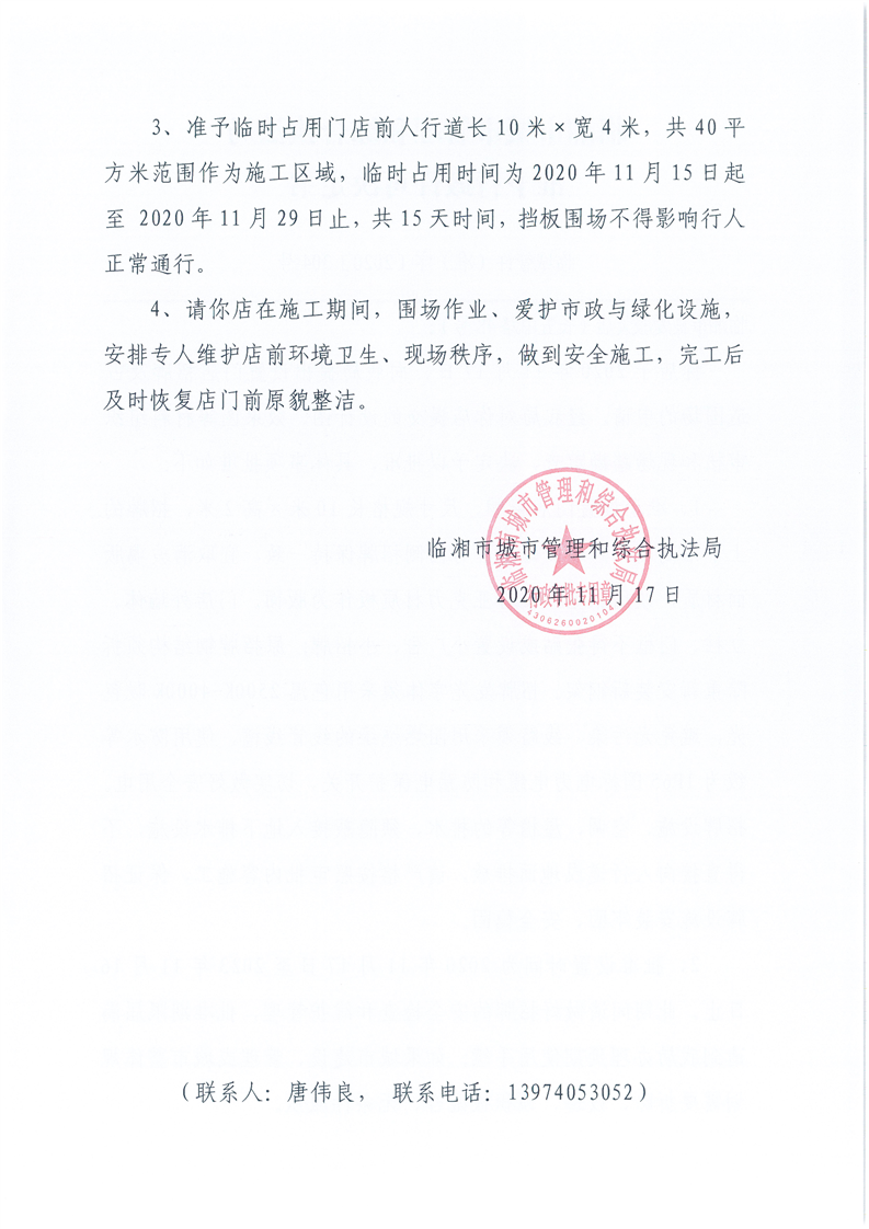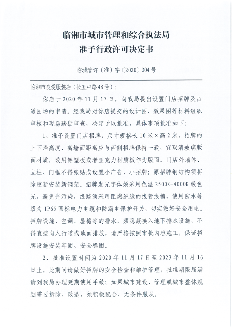 临湘市良爱服装店办理门店招牌设置、临时占用城市道路许可