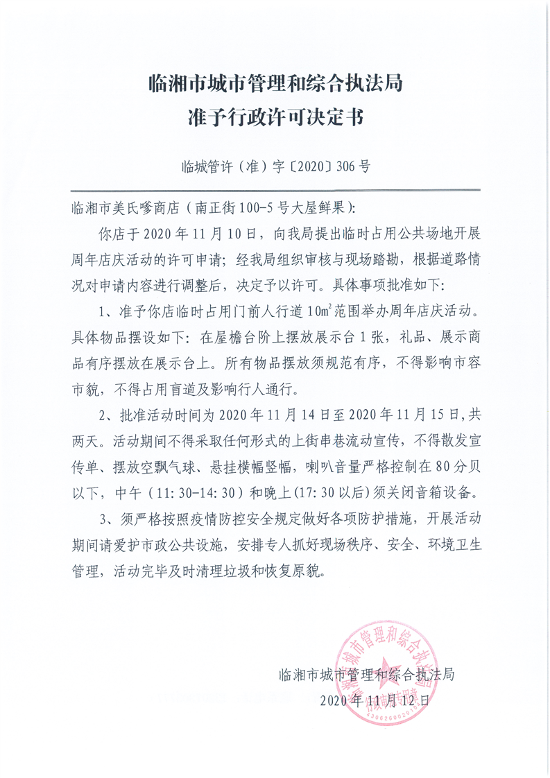 临湘市美氏嗲商店办理临时占用街道两侧和公共场地许可